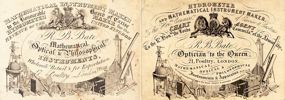 R.B. Bate operated an optical and scientific business in London during the first half of the nineteenth century. He got his start in 1804, taking over the business of his uncle and father-in-law (one in the same person), who had a commission to provide the government with hydrometers. Bate expanded the business to include microscopes and other optical equipment, plus a wide variety of other instruments. He was an optician, and so may have made at least the optical components of the microscopes, etc. that he sold. In 1833, he served as Master of the Spectaclemakers’ Guild. He was also Optician in Ordinary to King George IV and Queen Victoria (i.e. he was an official optician to the Royal Household).