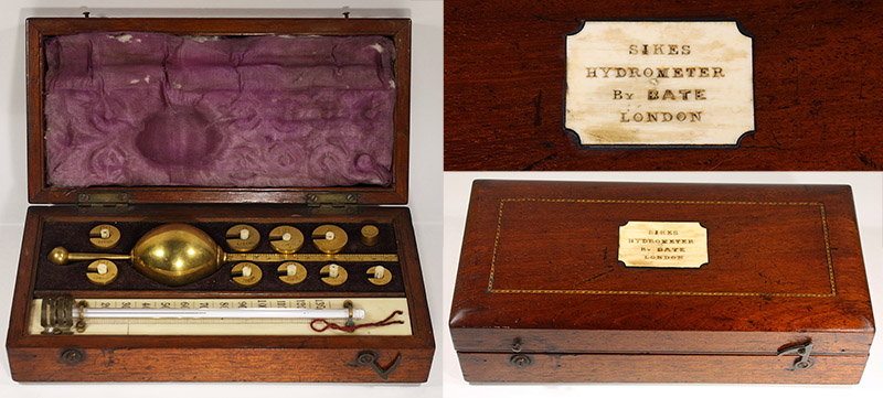 A cased Sikes’ hydrometer, by R.B. Bate. Many other manufacturers also produced Sikes’ hydrometers, from which Bate collected royalties.