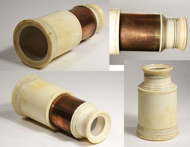 An ivory and brass prospect glass (a low power telescope for the theater or for peeping on other people at events), signed by Bate. Fully extended, it is about 3 1/4 inches / 8 cm long.