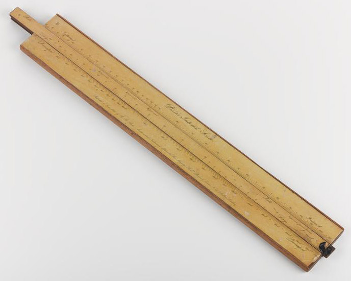 “Bate's Interest Scale” slide-rule, ca. 1824. Paper scales on wood, measuring 18 7/8 inches (47 cm) long. Adapted for nonprofit, educational purposes from http://collection.sciencemuseum.org.uk/objects/co60229/slide-rule-for-interest-calculations-ready-reckoners.