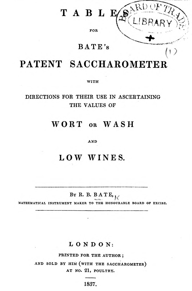Front page of the 1837 edition of “Tables for Bate’s Patent Saccharometer”, published by Bate.