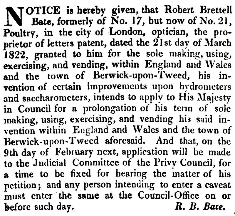 1836 application by R.B. Bate to renew his 1822 patents on hydrometers and saccharometers. From ‘The London Gazette’.