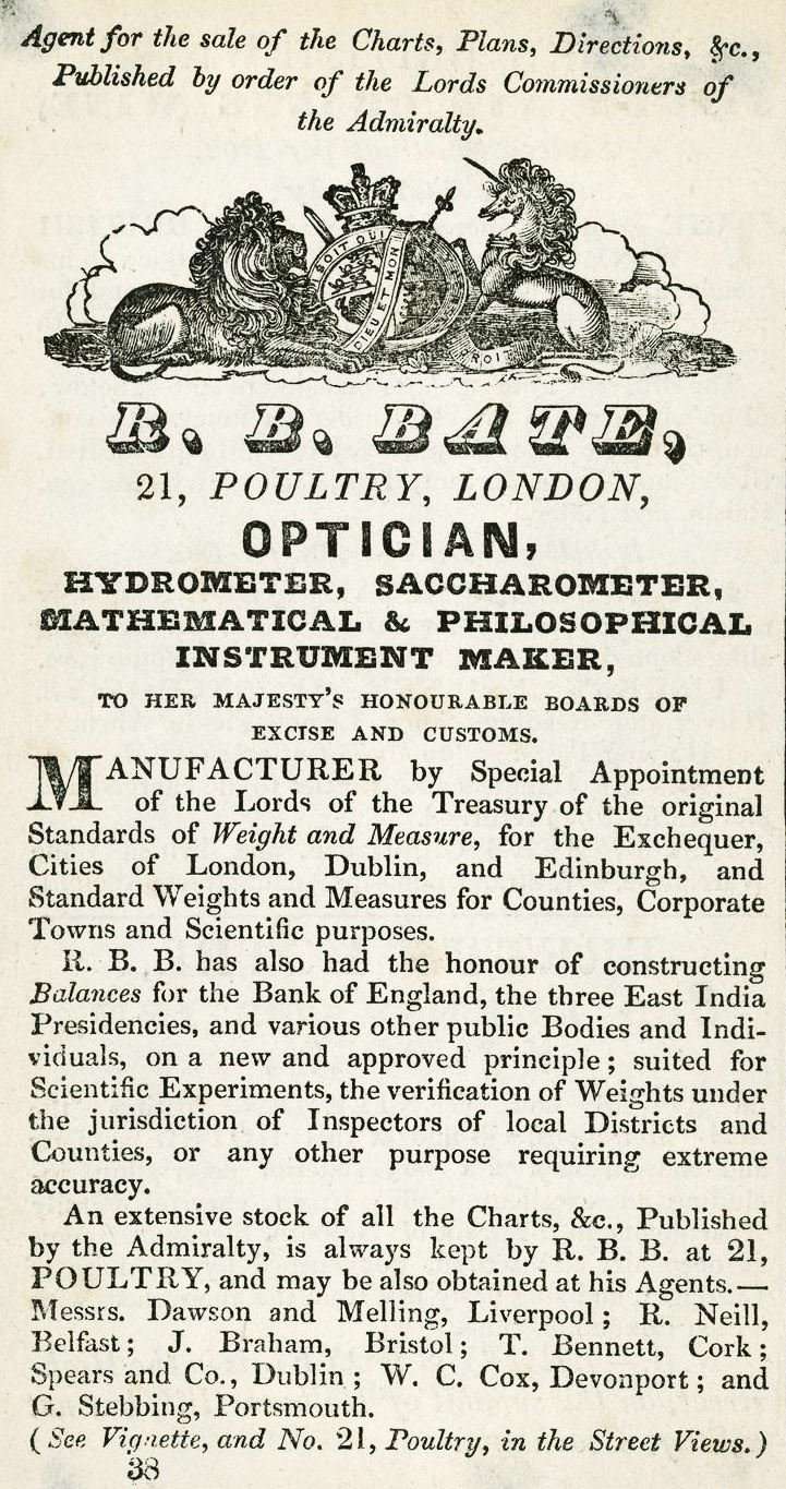 In addition to his optical and instrument business, Bate ventured in publishing. He wrote and published numerous handbooks on the apparatus that he sold, published other writers’ works on navigation, and co-published the Nautical Magazine. In 1830, he was appointed sole agent for Admiralty charts.