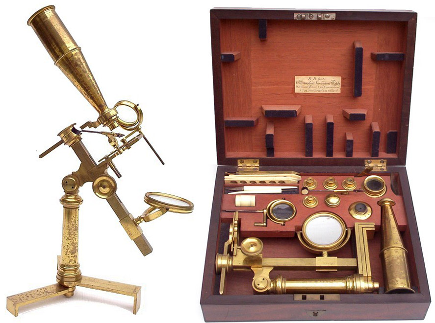 A “Jones’ Most Improved” pattern microscope, by Bate. Adapted from an internet site for nonprofit, educational purposes.