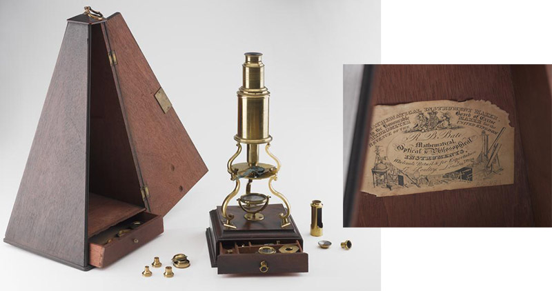 A “Culpeper” type microscope, bearing a trade card from Bate. Adapted for nonprofit, educational purposes from http://collection.sciencemuseum.org.uk/objects/co118219/culpeper-type-microscope-in-brass-with-drawer-of-culpeper-microscopes.