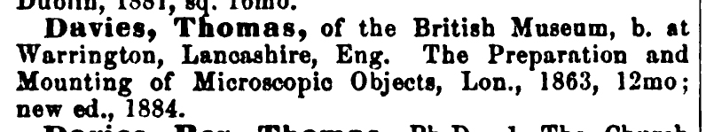 It has long been assumed that the book’s author was a London-based mineralogist named Thomas Davies, who lived from 1837 to 1892. This attribution dates back to at least 1891, when Allibone's Critical Dictionary of English and American Authors described the geologist as having been the author (Figure 2). Whoever compiled the entry for Davies did not research the topic very well, as it contains at least one obvious falsehood. The mineralogist was born in the parish of St. Pancras, London, not in Warrington. There are no indications that this Davies ever lived in Warrington, which is located between Liverpool and Manchester, England. As discussed below in greater detail, the author of The Preparation and Mounting of Microscopic Objects was definitely from Warrington.
