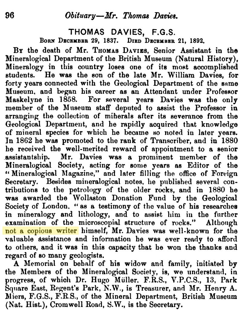 Geological Magazine (1893) Obituary of Thomas Davies, Vol. 30, page 96