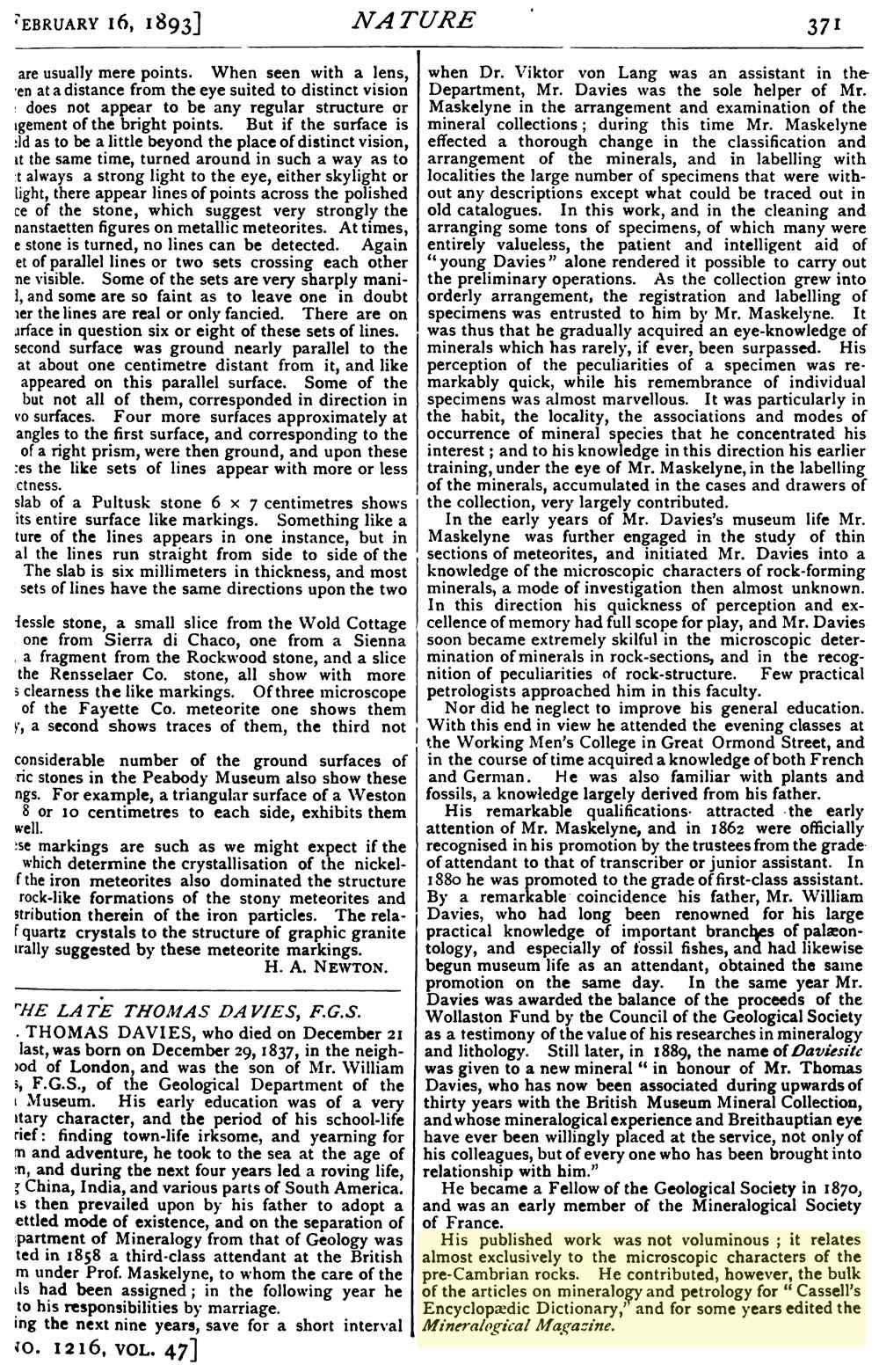 Nature (1893) Obituary of Thomas Davies, Vol. 47, page 371