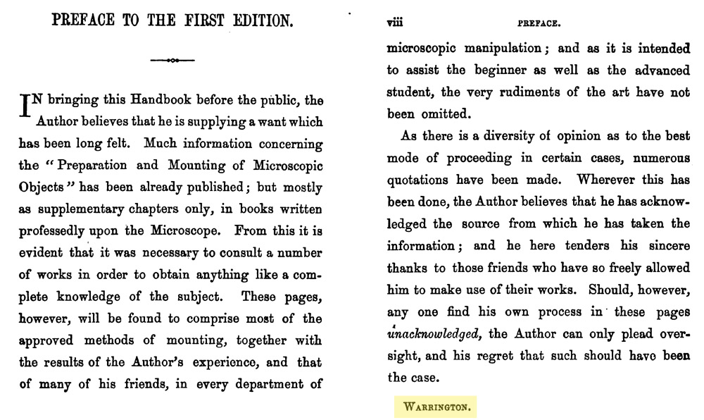 Having discounted the London mineralogist, who was the true author of The Preparation and Mounting of Microscopic Objects? An important clue comes from the book’s second edition, published in 1873. Davies’ preface to the first edition was reprinted, with the addition of his residence: Warrington (Figure 5). Census records indicate that two men named “Thomas Davies” lived in the vicinity of Warrington in 1861: a 49 year-old “brazier” (brass worker) and a 30 year-old “gentleman”. The 1871 census recorded the brazier as being “retired”, and the now 40 year-old gentleman still living with his mother, elder brother and a servant.