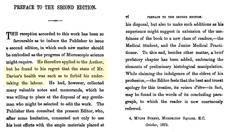 Around 1872, his publisher approached Thomas Davies with a proposition to revise The Preparation and Mounting of Microscopic Objects for a second edition. Davies was then in poor health, and could not undertake the job. John Matthews was enlisted to revise the book, using both Davies’ notes and his own experience in microscopy.