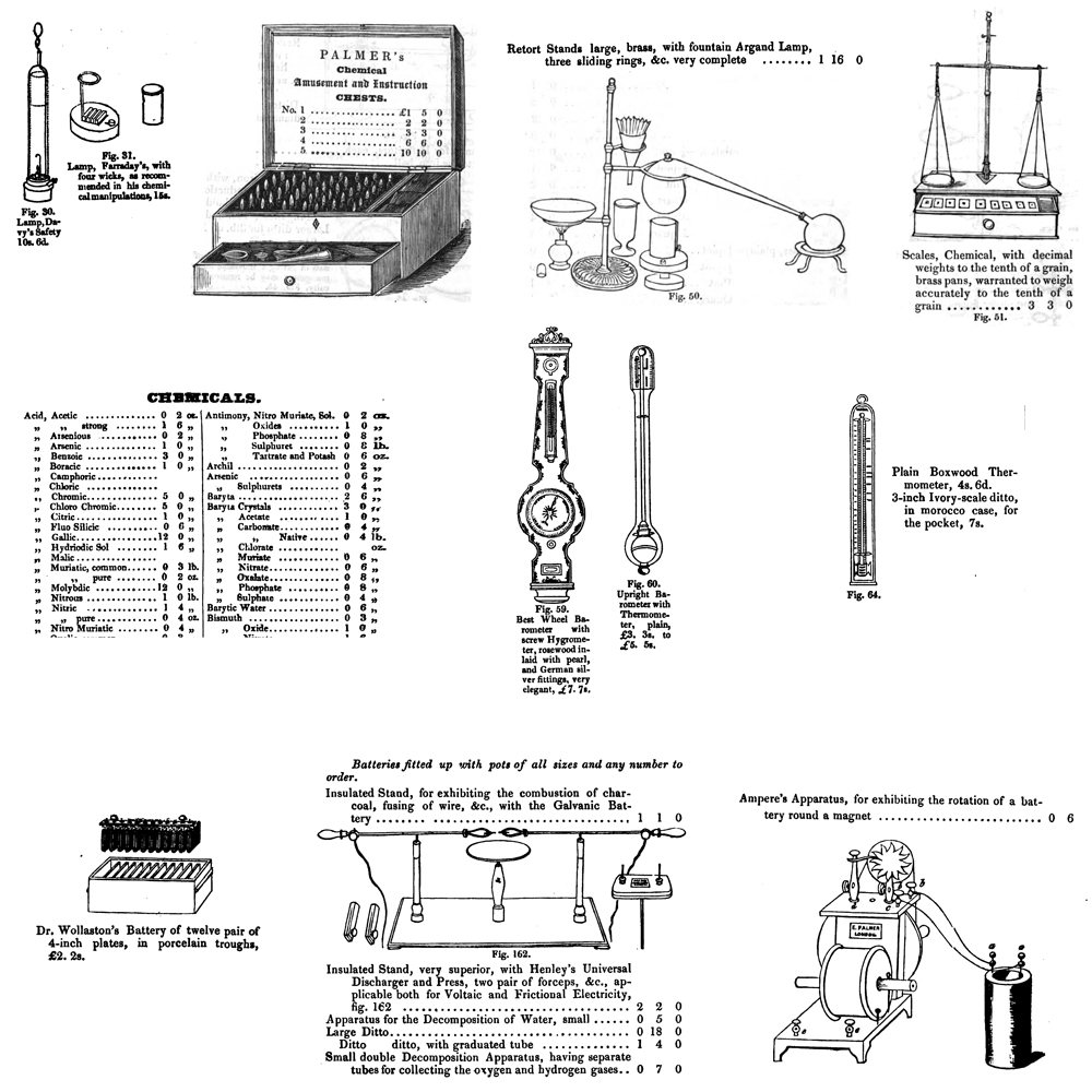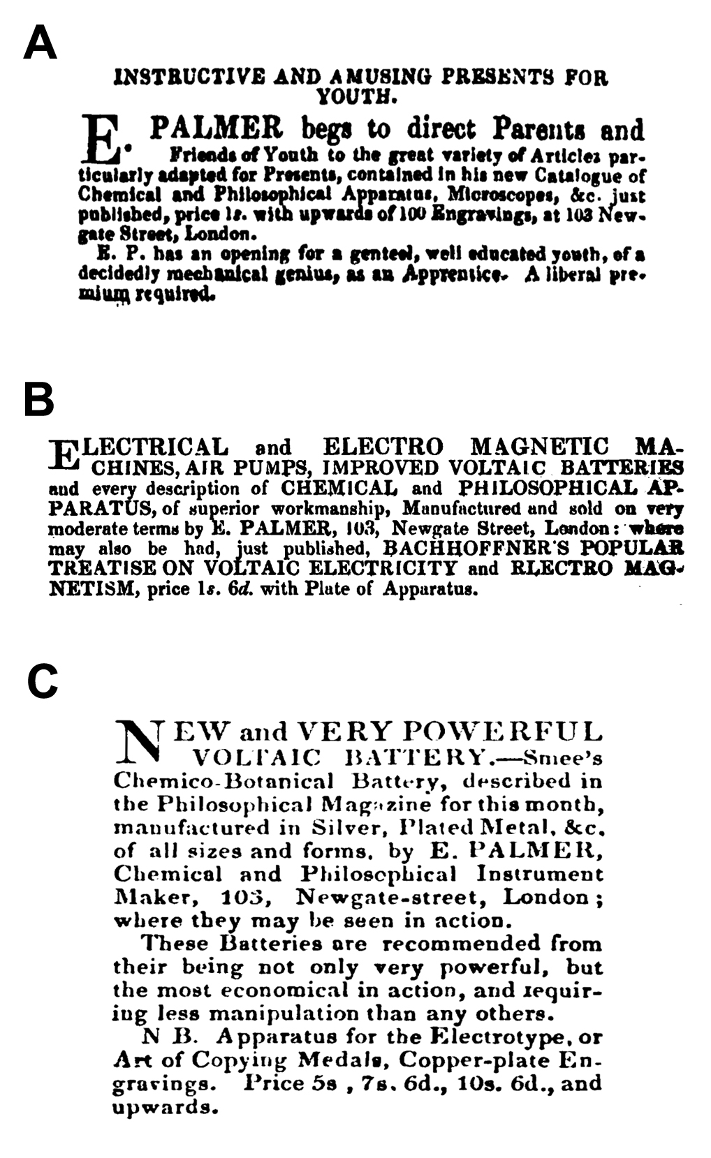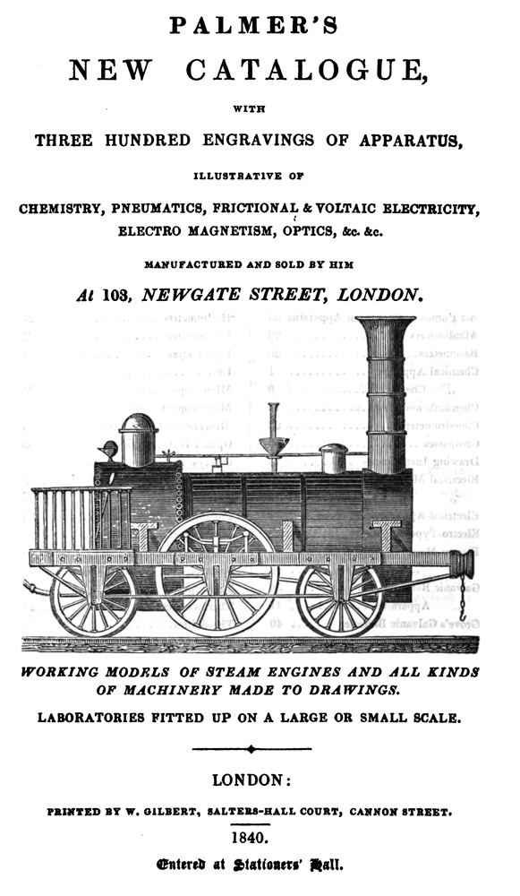 Palmer, Edward (1838) A Catalogue of Electro-magnetic and Voltaic Apparatus, Manufactured by Edward Palmer, Philosophical Instrument Maker, 103, Newgate Street, London, J. Nichols, London (download)