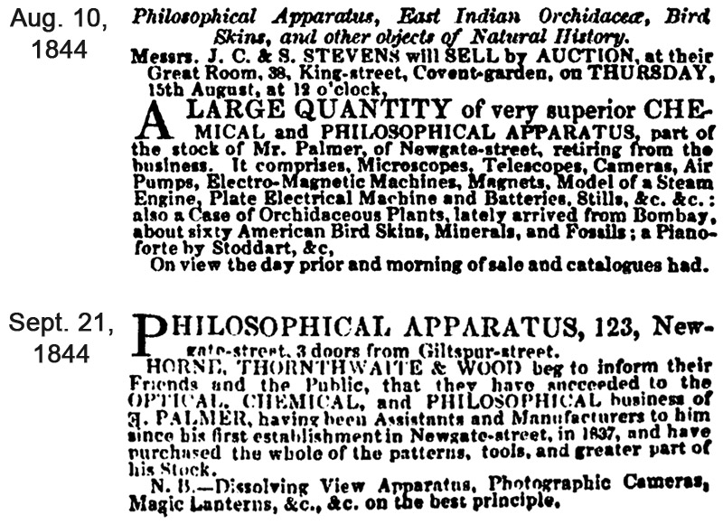 In August, 1844, Palmer closed his business and sold off his stock (Figure 11). The bulk of his goods was acquired by Fallon Horne, William Henry Thornthwaite, and Edward George Wood, all of whom described themselves as long-term employees and suppliers (Figure 11). Thornthwaite was the author of Photographic Manipulation (described in the preceding paragraph), which was one of the first books to be published on photography. The first edition was published by Palmer in 1843 without naming the author. The second edition, also published by Palmer in 1843, gave authorship credit to Thornthwaite. The company of Horne, Thornthwaite, and Wood (later Horne and Thornthwaite) produced microscopes, photographic equipment, and other optical apparatus and supplies until 1911.