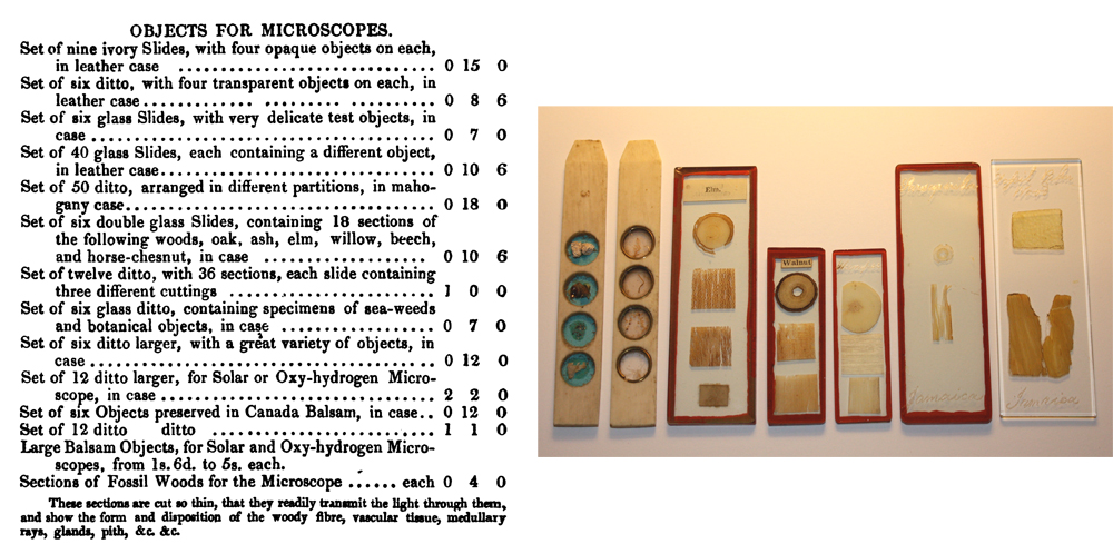 wood, double glass slide containing botanical objects (sarsaparilla), and a slide