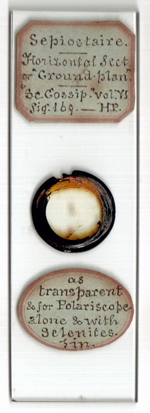 Figure 4. A microscope slide of “sepiostaire” (cuttle fish bone), citing an 1870 paper on the topic written by Henry Pocklington (see Figure 5).