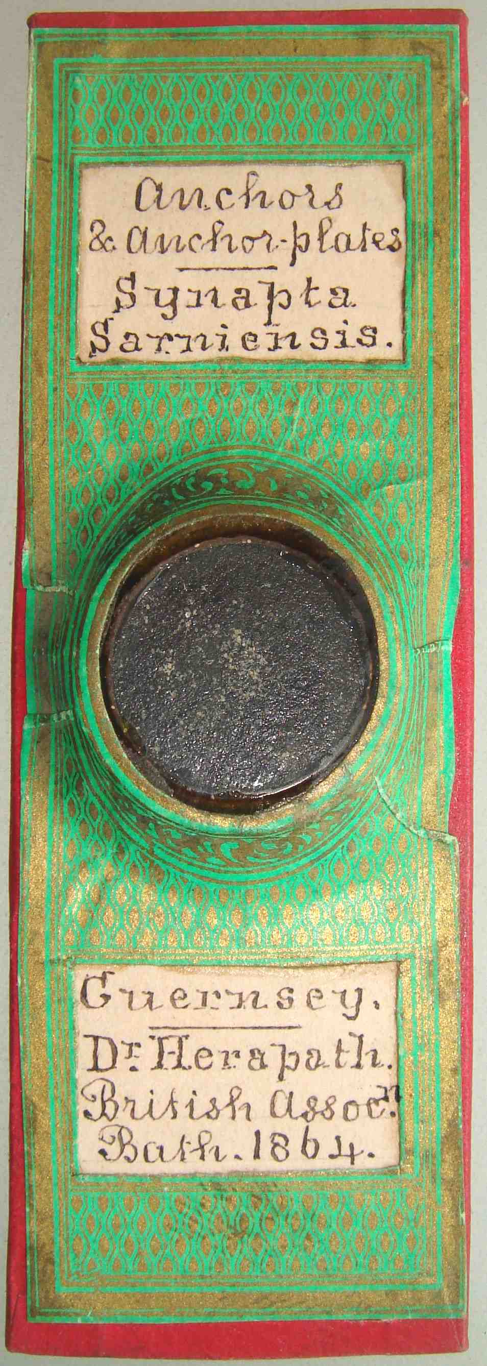Muddying these conclusions is the existence of another slide by the same maker, but with the name “Dr. Herapath” on the label (Figure 6). William Bird Herapath was a medical doctor and scientist. He is most famous for the discovery of “herapathite”, a crystal of iodoquinine sulfate, which form the basis of Polaroid camera film. Herapath was a man of his age, and explored a broad range of the sciences. In 1864, he described a new type of synapta (sea cucumber) acquired from Guernsey, which he named Synapta gallieni vel sarniensis (i.e. Synapta gallieni or S. sarniensis, now known as Leptosynapta galliennii). The microscope slide shown in Figure 6 is a specimen from that animal. I feel it unlikely that Herapath made this slide, though. For one thing, no other known slide produced by this maker is labeled “Herapath” – if Herapath made all these slides, one would expect many of them to be similarly labeled. Second, the honorific “Dr.” would be excessive for someone labeling his own slides for his own collection, even if he felt the need to write his name on the slides. Third, Herapath primarily named the species “gallieni”, after the man who collected the first specimens, so it is highly unlikely that Herapath would have labeled a slide as only “Synapta sarniensis”. The strongest conclusion is that this slide was actually made by someone else, probably Henry Pocklington, who either attended or read about Herapath’s lecture, then made his own slide of the synapta.