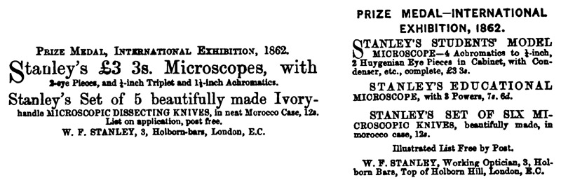Information in Stanley’s 1873 ‘A Descriptive Treatise on Mathematical Instruments’ (fourth edition), indicating that he operated two main ‘departments’, each at a different addrress: the Mathematical Department at 3-5 Great Turnstile and the Optical Department (including microscopes) at 134 Railway Approach. London Bridge. The earlist identified references to the Railway Approach address are from 1873, suggesting that he opened this shop during that year.