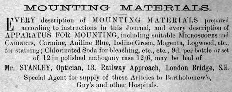 An 1883 letter to the editor of The Students’ Journal gave Stanley’s price for medically-oriented slides, and information that he also supplied unmounted anatomical/pathological specimens, “Sir, In reply to the ‘proposition’ of ‘Spes in Fides’, in the Students' Journal of the 10th inst., I shall be pleased to supply pathological specimens such as the students require at the rate of 1s. 6d. per slide, which would come cheaper than the £1 1s. for 3 months, as suggested by ‘Spes in Fides’. Also I am supplying a set of 20 sections in tubes, ready cut and stained, for 6s., which I think will be a great boon to medical students to mount themselves”.