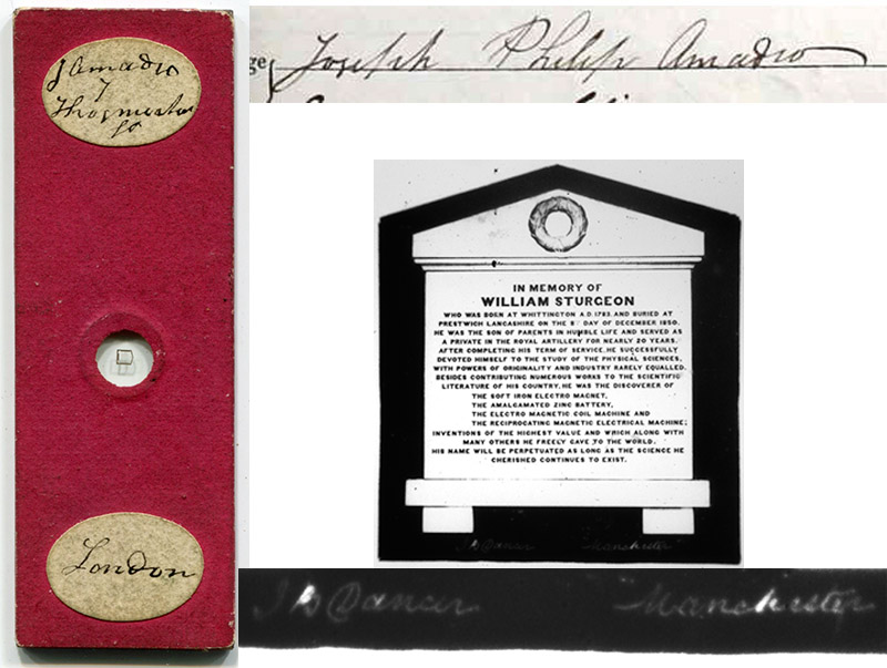 A paper-wrapped J.B. Dancer microphotograph, labeled for sale by J. Amadio. The handwriting on the slide matches Joseph’s signature from his marriage record, shown to the right. Handwriting seen on other Amadio microphotographs also matches Joseph’s handwriting. The image on this slide is "Sturgeon’s Tablet", number 1 in Dancer’s lists, and bears the maker’s signature and address of Manchester within the photograph.