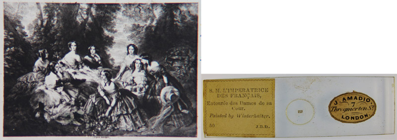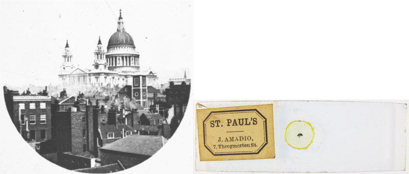 distinctive handwriting. The five red slides on the right were made by Charles Topping. Amadio and several other big retailers, such as the Smith and Beck consortia, frequently hid the identities of their suppliers, hence the circular stickers that cover Topping’s name on three of the slides. By preventing customers from knowing the actual makers