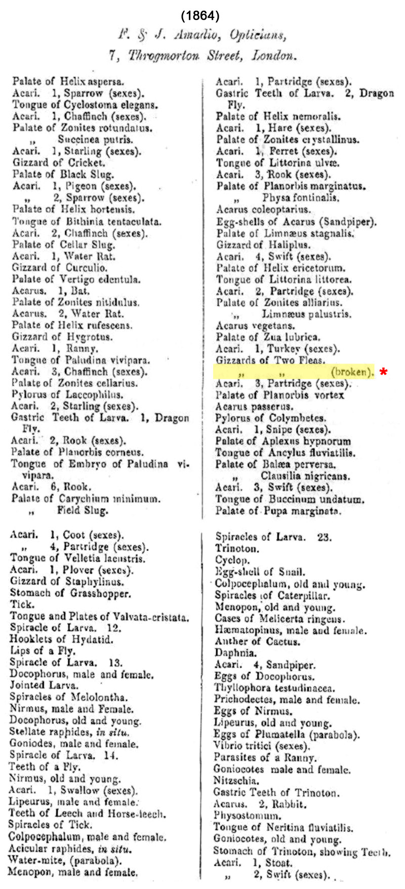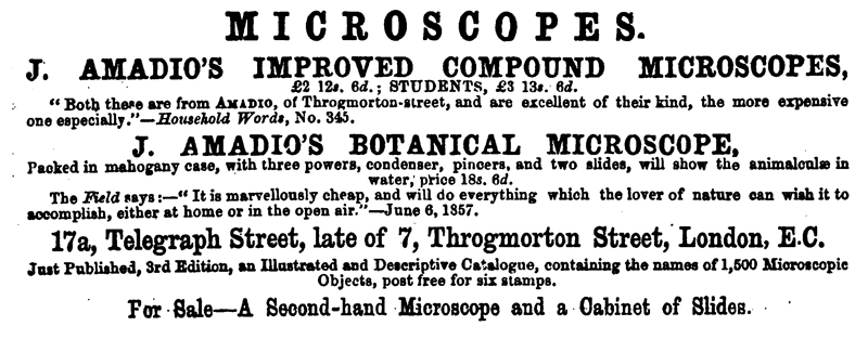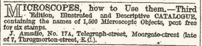 Advertisements as late as 1862 listed the microscopy business as being that of “J. Amadio”. The 1863 Goldsmiths', Jewellers', Silversmiths', Watchmakers', Opticians', and Cutlers’ Directory listed Joseph and Francis separately, “Barometer and Thermometer Manufacturers .. Amadio F., 5 Birchin-lane, E.C.” and “Wholesale, Manufacturing and Working Opticians .. Amadio, F., 5 Birchin-lane, City; Amadio, JP, 7 Throgmorton-street”. The 1864, third edition of Amadio’s catalog listed the shop as “F. and J. Amadio”.