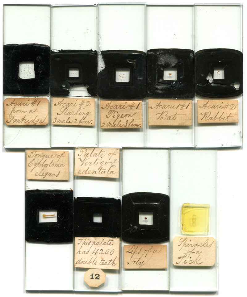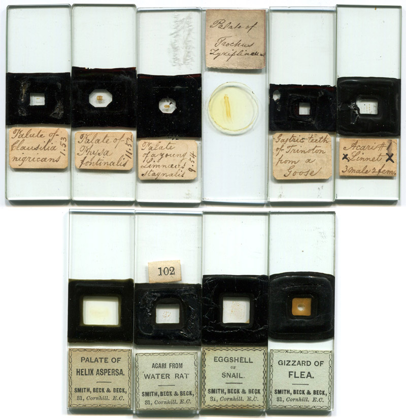 preparations of parasitic mites (“acari”) and snail palates/tongues/radulae, and almost