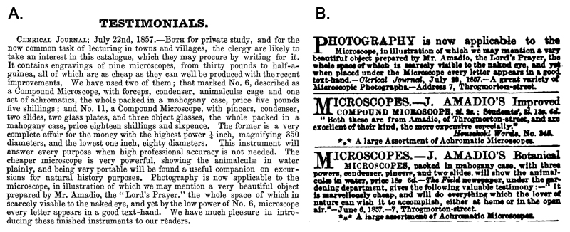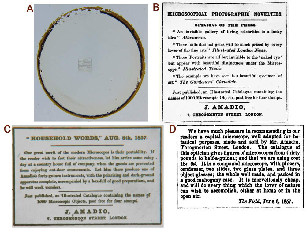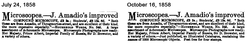 Two Amadio catalogs have been identified. One printed without a date (evidently the first edition) was likely published in 1858, and the third was published in 1864 (as F. & J. Amadio). Advertisements indicate that the second edition was published in 1860. The 1858 and 1864 catalogs contain essentially the same microscopes, with the 1864 prices being slightly lower than those of 1858. The microscopes were similar to those sold by other manufacturers of the time, of moderate price, and likely to appeal to students and middle-class buyers. Amadio’s slides were all brought in, with makers that included prestigious mounters such as Charles Topping, John Barnett, Joseph Bourgogne and John B. Dancer. Amadio evidently had positive relationships with Charles Dickens and other publishers, who wrote numerous supportive articles about Amadio’s products and undoubtedly helped his sales.