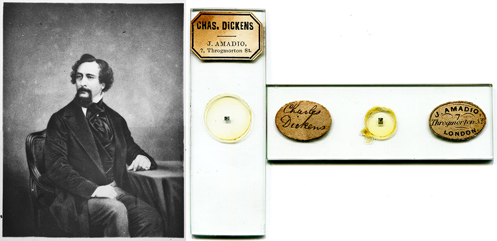 An advertisement in the April 9, 1859 issue of The Law Times included this testimonial, “Microscopic Photographic Curiosities – Mr. Amadio of Throgmorton-street, whose portrait of Mr. Charles Dickens no larger than a pin's point, we lately noticed, has produced by photography a view of Westminster-bridge with the Houses of Parliament and Westminster Abbey, within a space not larger than the eye of a worsted needle. Although the elements of the landscape cannot be distinguished by the naked eye, under a microscope of ordinary power, the photograph represents a broad view, in which every feature is plainly brought out, from the barges in the river and the foliage of the houses in Whitehall-gardens to the Westminster churches in the background. Two river steamboats lie at the pier, and their steam as it is impetuously discharged from the funnel, and dies off in wreaths in front of the bridge, is shown with all the accuracy of a large photograph. The same gentleman has published a portrait of a youth, which is only just larger than a needle‘s point, but when magnified is as perfect as any conceivable likeness.-Daily News, March 10th”.