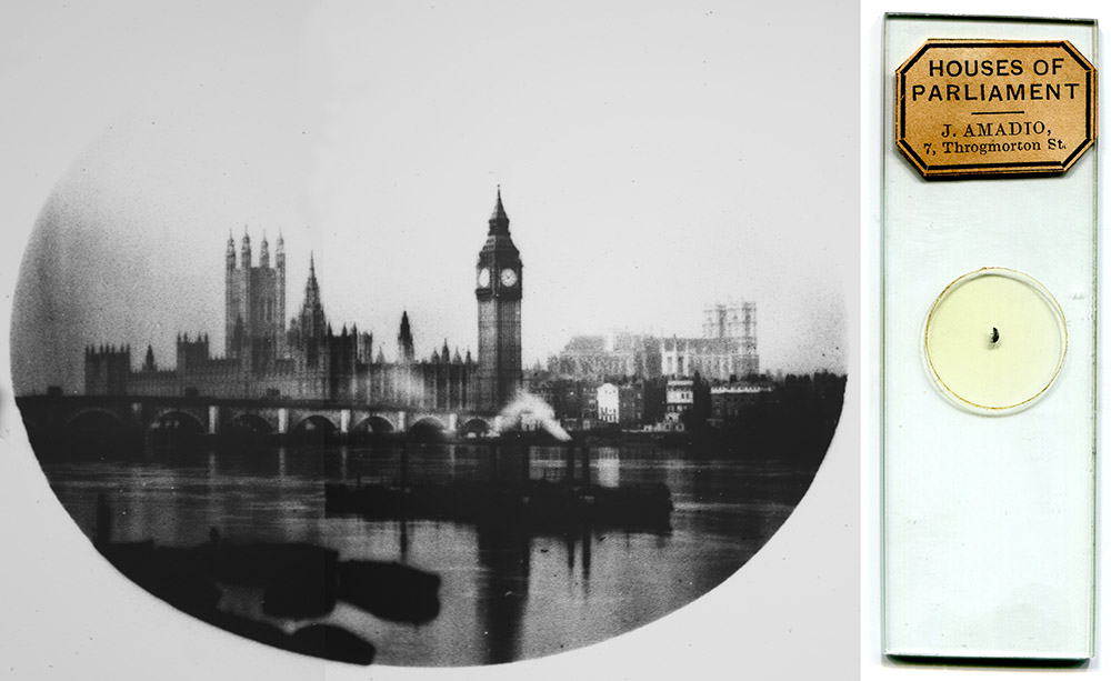 The Spectator, February 26, 1859, “Mr. Amadio continues his progress in reducing the scale of microscopic photographs. We have this week seen two that excel any specimens hitherto brought under our notice. One, which to the naked eye looks like a mere speck on the glass, the minute trace of some stain, under the microscope becomes a beautiful landscape picture - a clear and distinct view of the Houses of Parliament, with Westminster Bridge, the Abbey in the distance, two steam-boats, and several barges. It is, however, not simply the minuteness of the picture which is so remarkable, but its finish and breadth. The architecture, the aerial perspective, the soft but brilliant and well balanced distinction between the shine upon the water and the shade, are brought out with equal force and finish. To the naked eye the other specimen is an exceedingly small circular speck, such as might be left if the glass were touched with a damp pin's head, the pin being by no means large; under the microscope, this develops itself into a beautiful portrait, such as might have been painted by Guercino, being the head of a youth, Mr. J.E. Pedder, an Eton scholar, the son of Mr. Pedder, of Preston Park in Lancashire. By the help of this microscopic photography a single locket becomes a picture gallery of family affection or history”.