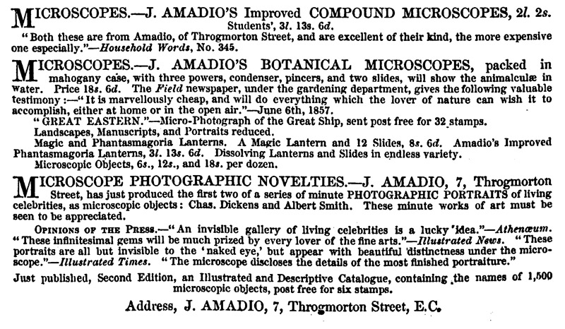 The Living Age, April 30, 1859, “Microscopic Photographs. We have been favored with an inspection of some marvellously beautiful specimens of microscopic photography taken by Mr. J. Amadio, whose excellent compound microscopes are now so favorably known in the scientific, and especially in the botanical world. The portraits of living celebrities, such as Mr. Charles Dickens, Mr. Albert Smith, and Miss Sedgwick, have already earned their due need of admiration; but the most exquisite specimen yet produced is a portrait of a youth which occupies the infinitesimally minute space of the two-hundredth part of an inch. To say that this Lilliputian picture is as large to the naked eye as a pin’s head would be an exaggeration ; for surely no pin was ever made whose head could equal this in minuteness. A pin’s point would probably be much nearer the truth. Of course nothing can be made of them by the unassisted vision; but when submitted to one of Mr. Amadio’s common pocket microscopes every feature comes out with wonderful sharpness and distinctness, and we behold a perfect portrait. Under a microscope of higher power, the effect is naturally very much better. Another beautiful specimen is a view of the Thames at Westminster, including the Houses of Parliament, Westminster Abbey. etc. To the eye this appears more like a preparation of some minute insect than any thing else, the river and ground view doing duty for the body, and the spires and turrets for the legs of the animal; but under the microscope it comes out with astonishing distinctness, every architectural detail being most accurately marked”.