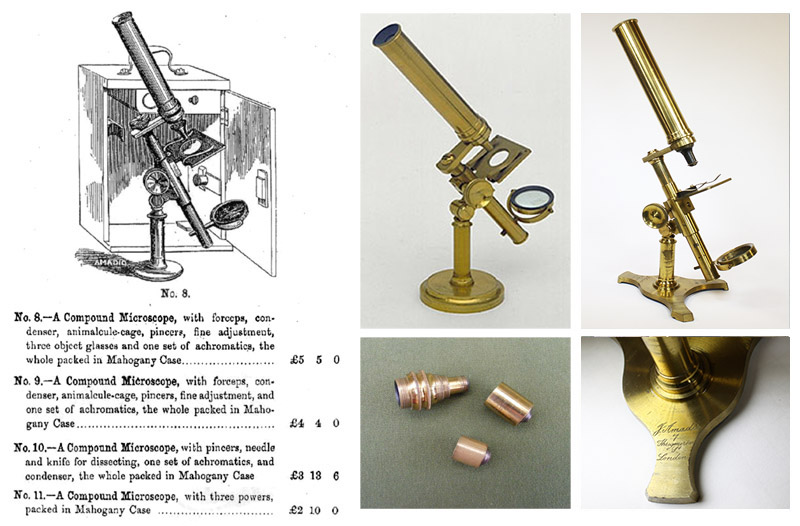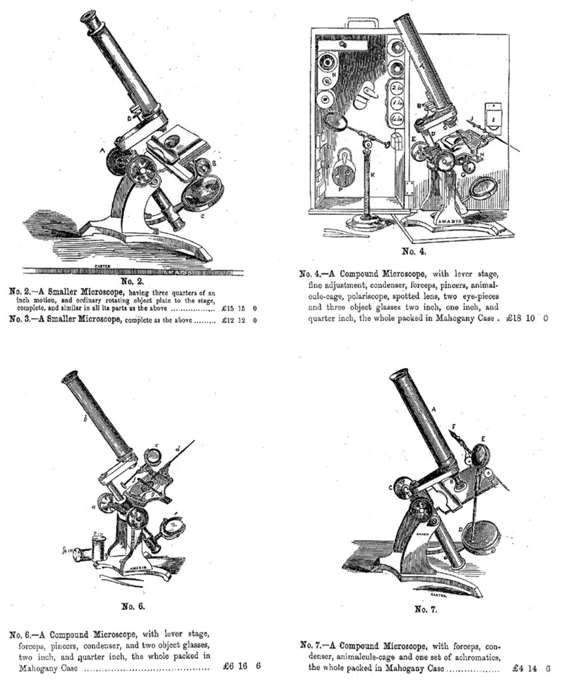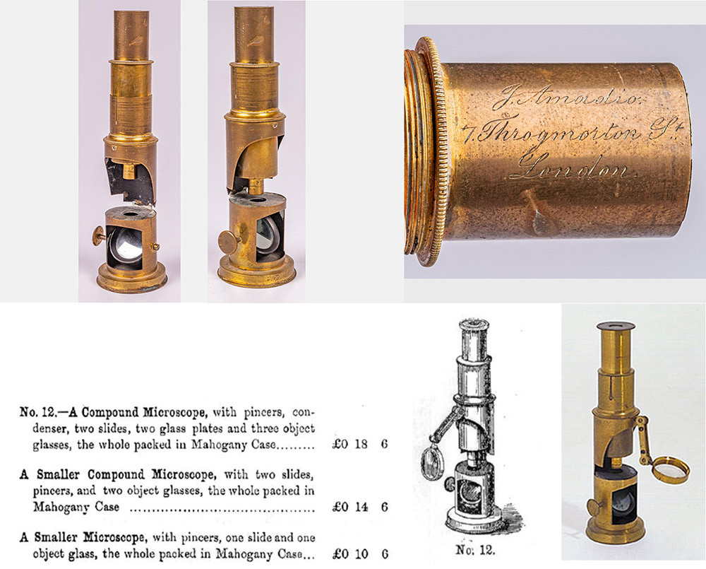Amadio's 1858 and 1864 catalogues featured inexpensive, drum-pattern microscopes, likely of French manufacture. Contemporary writers referred to item number 12 as “Amadio’s 18 shilling microscope”,