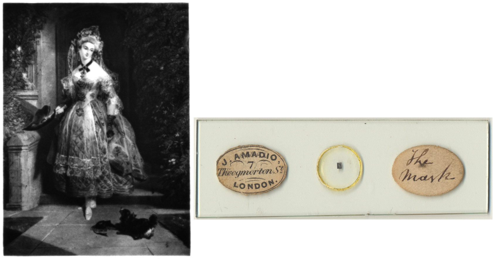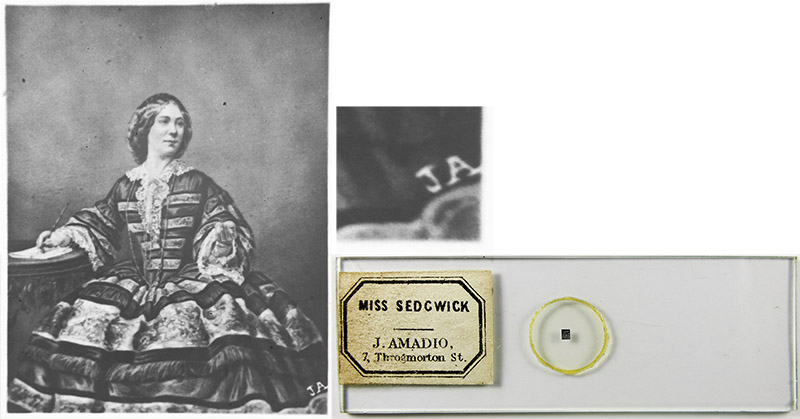Microphotograph of actress Amy Sedgwick (1835-1897). Joseph Amadio’s initials are fixed into the negative, indicating that this image was made by/for him. The shape of the printed label suggests that it was made for Amadio by William Overend Geller (see below).