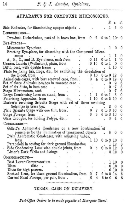 Amadio, Francis and Joseph Amadio (1864) A Catalogue of Achromatic Microscopes and other Optical, Philosophical, and Mathematical Instruments, Manufactured and Sold by F. & J. Amadio, Opticians to the Admiralty, 7, Throgmorton Street, London