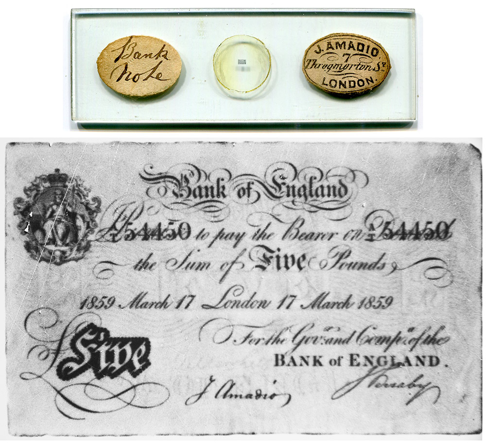 Microphotograph of a 5 Pound note, with Joseph Amadio’s signature towards the bottom. The signature indicates that this microphotograph was prepared by or for him. The bank note is dated 17 March, 1859. The image is different from microphotographs known to have been made by other photographers/retailers.