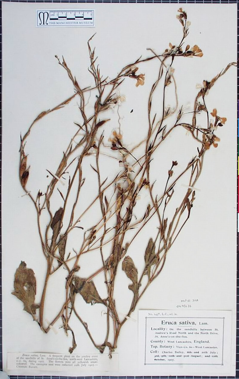 A specimen of Eruca sativa, collected by Charles Bailey in 1907. Adapted for nonprofit, educational purposes from the Herbarium of the Manchester Museum, https://herbologymanchester.wordpress.com/category/identification/.