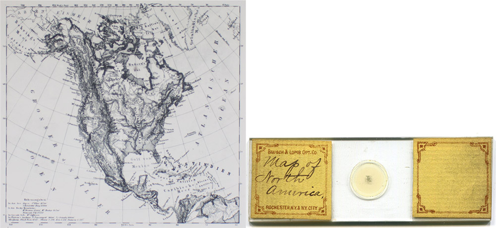 “Map of North America” microphotograph, with Bausch & Lomb labels. Note that all of the words on the map are written in German. This microphotograph slide was probably produced by J.D. Möller (see Figure 3, below).