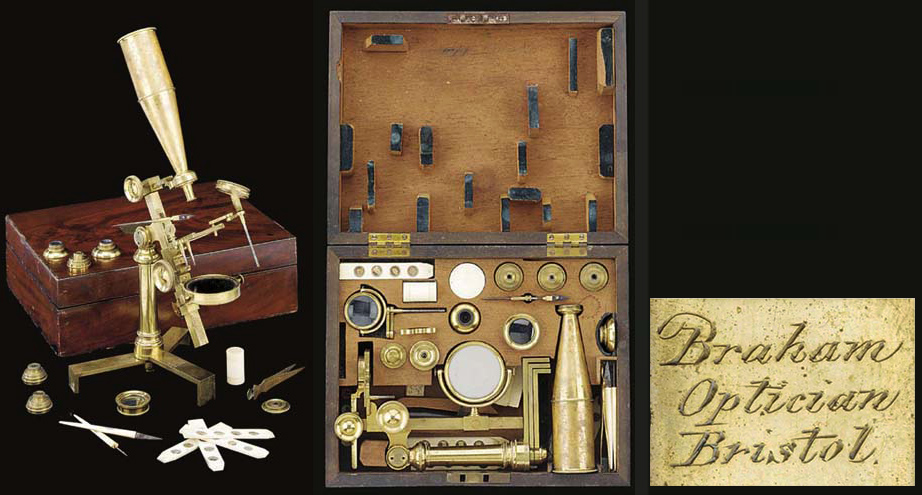 Circa 1830-40 microscope, with “Braham Optician Bristol” on the foot. It was probably made by a London wholesale manufacturer. Adapted for nonprofit, educational purposes from an internet auction site.
