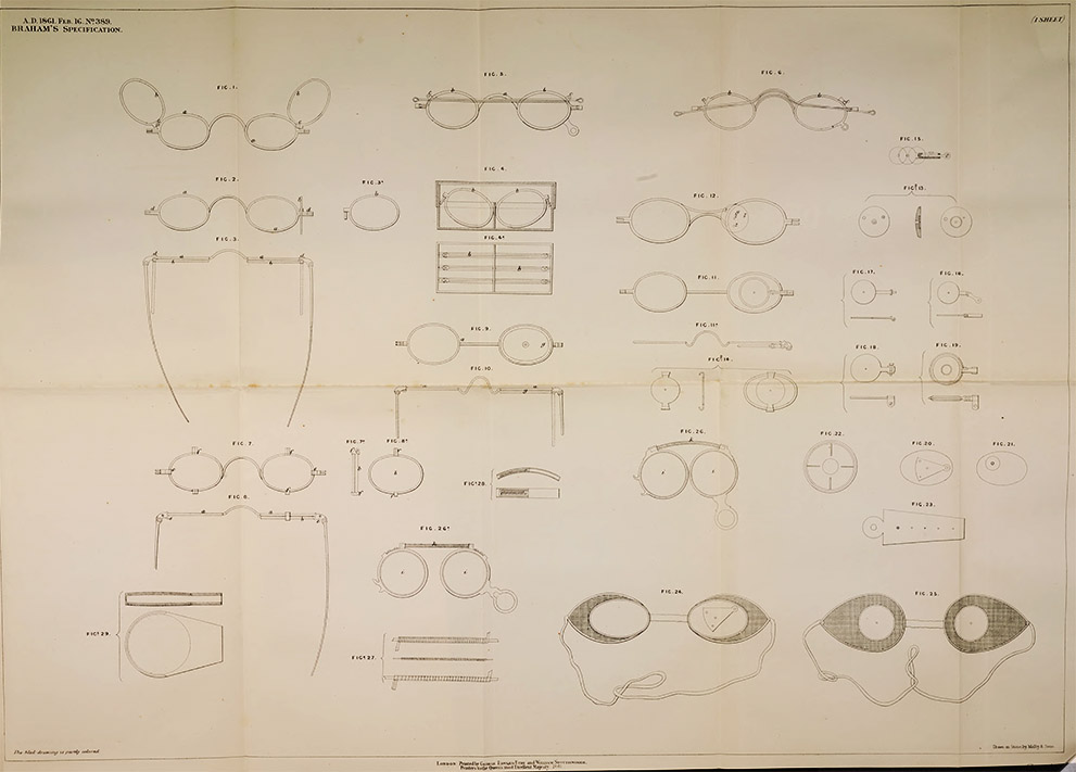The illustration of eyeglass frame styles that accompanied John Braham’s 1861 patent application and award.