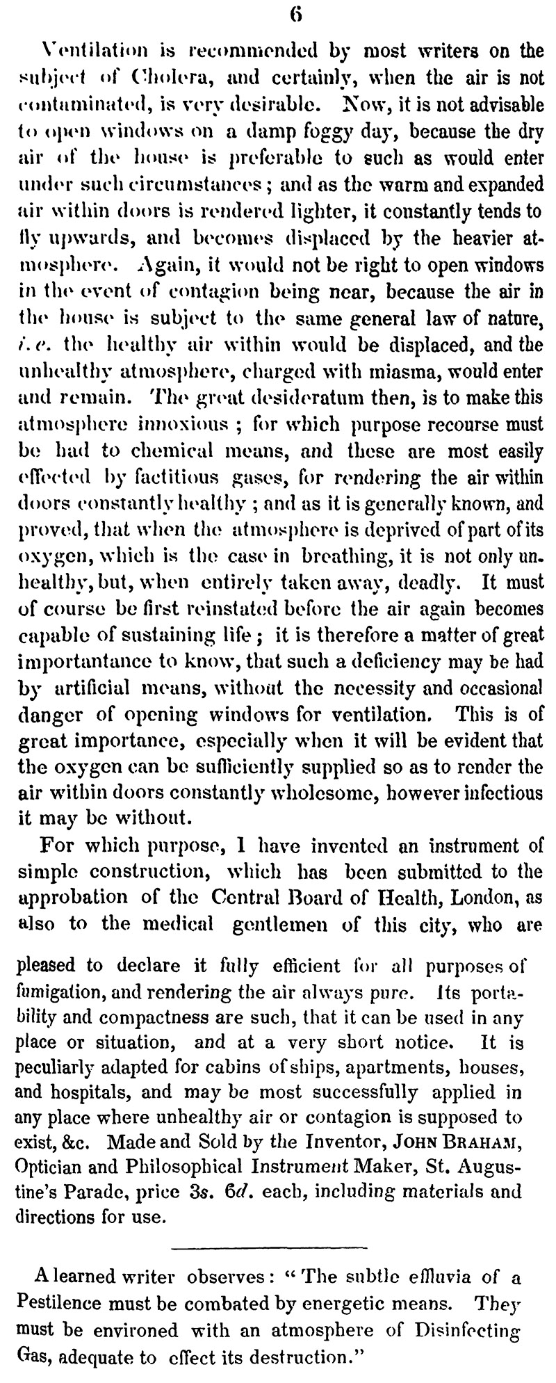 Prior to 1832, another move occurred, to 10 St. Augustine’s Parade. That year, Braham published a booklet that described the “science” behind a device that he had invented to “purify” household air and prevent cholera and other diseases (Figure 6). This being several decades before general acceptance of the germ theory, it was commonly thought that diseases were spread through air contaminated by “foul or deleterious vapours”. Unfortunately, Braham did not describe the machine, nor provide an illustration. As were many other scientific instrument makers, Braham was very interested in magnetism and electricity for medical purposes (Figure 7), so his device may have been some combination of the two. Perhaps a sparking device that produced ozone?