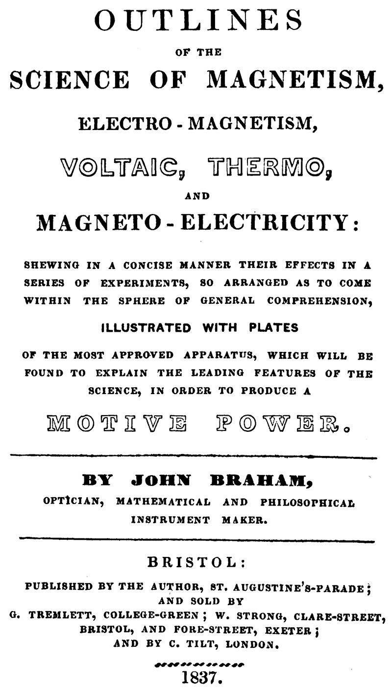Braham, John (1837) Outlines of the Science of Magnetism, Electro-Magnetism, Voltaic, Thermo, and Magneto-Electricity, Braham, Bristol