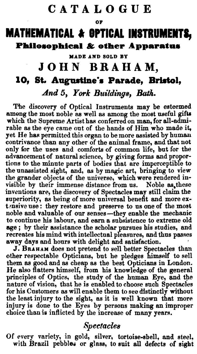 In 1852, The London Gazette announced the dissolution of the Braham Brothers’ optician partnership. Presumably, this was the end of the apparent business agreement between John and George. George died in 1865, and his business in Bath was continued by two sons as “Braham Brothers”.