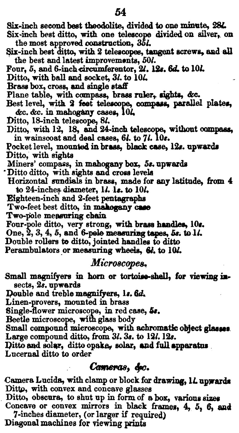 Braham published a “Catalogue of Mathematical and Optical Instruments, Philosophical and Other Apparatus” in 1837, in the back of his book on “Outlines of the Science of Magnetism, Electro-Magnetism, Voltaic, Thermo, and Magneto-Electricity” (Figures 7-8). Microscopes were evidently a small part of Braham’s inventory. He offered “small” and “large compound microscopes” with prices ranging from £3 3s to £12 12s, which could encompass each of the instruments shown in Figures 1-3, above. Solar and lucernal microscopes were available by special order, implying that the market in Bristol was not sufficient for Braham to keep those instruments in his inventory. A variety of simple magnifiers rounded out his selection, including “flower microscopes” see this site’s essay of W. & S. Jones, Figure 13 for illustrations.