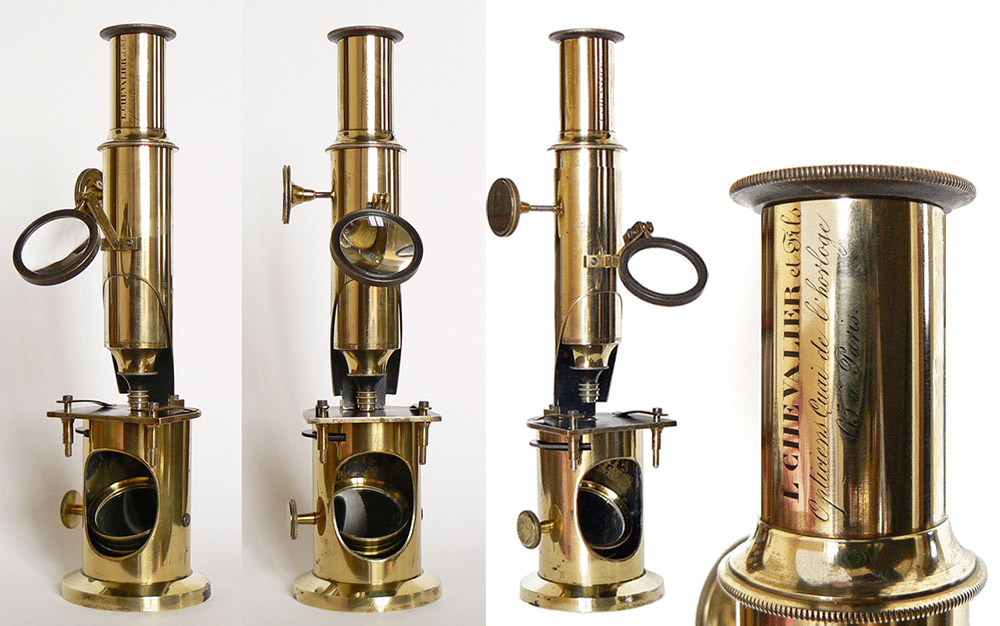Louis Chevalier was a relatively minor Parisian microscope maker, who is most notable for having been a younger brother of the well-known microscope manufacturer Vincent Chevalier (1771-1841). Only one microscopes from a Louis Chevalier business is known to survive, a ca. 1848 drum-type compound instrument signed "L. Chevalier et Fils" (Figure 1). The 1828 Dictionnaire Technologique ou Nouveau Dictionnaire Universel des Arts et Metiers stated that Louis Chevalier then made achromatic lenses in the style of his brother, Vincent. From 1849 onward, Louis manufactured simple microscopes with lenses and object holders that could be adjusted to any angle, which were useful for comparing hallmarks on pieces of jewelry, etc. Examples of that microscope type has not yet been identified.
