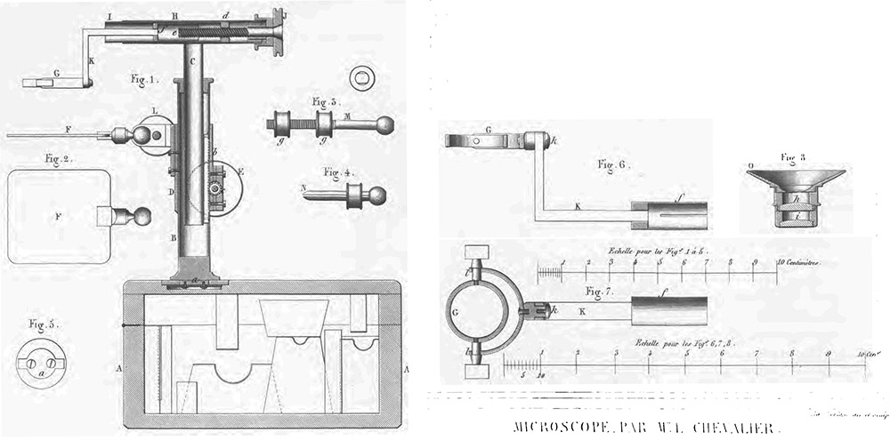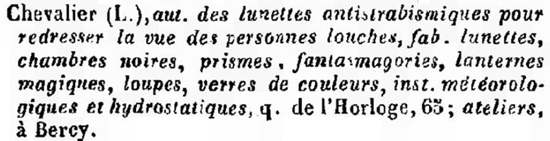 The "Microscopes" section of the 1828 Dictionnaire Technologique stated that "c'est ainsi que M. Vincent Chevalier les exécute; il en a fait cependant de 2 lignes et demie et même d'une ligne de foyer, et son frère, Louis Chevalier, en a aussi fabriqué de pareils". ("Mr. Vincent Chevalier produces only achromatic lenses with four lines of focus, however, he has made lenses of two and a half lines and even one line; and his brother, Louis Chevalier, also made similar ones."). This implies that Louis Chevalier was manufacturing achromatic objective lenses during the 1820s.