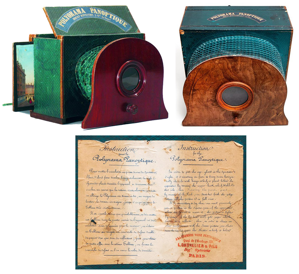 Two ca. 1850 "Polyoramas", and an attached instruction label, from L. Chevalier et Fils. The user looks through the front lens toward a picture that is printed on translucent tissue paper. The hinged top has a mirror on the underside, and the rear of the box is open. When viewed with the top opened, light is reflected onto the front of the image. Slowly closing the lid reduces reflected light and brings in light from the back, which darkens the front image and illuminates a second image that is embedded in the tissue. The effect may be to turn a scene from daytime to night, or change to a completely different scene (see Figure 4). Adapted for nonprofit, educational purposes from the Museum of Cinema-Tomàs Mallol Collection, and from an internet auction site.