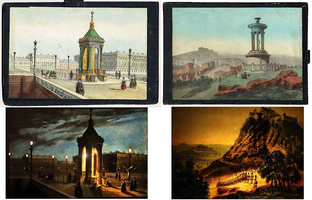 Two Polyorama views (see the legend of Figure 3 for a description of how the device works). The left view changes from a daytime to a nighttime scene of the chapel on the Nicholas Bridge, St. Petersburg, Russia. The right view changes between two very different pictures of Edinburgh Castle, Scotland. Images adapted for nonprofit, educational purposes from an internet auction site.