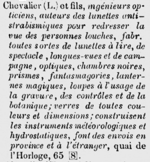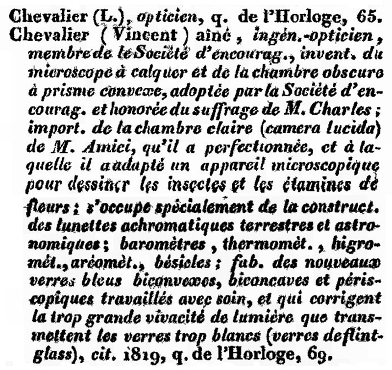 Entries from the 1823 "Almanach du commerce de Paris", which clarifies that it was Vincent Chevalier, not brother Louis, who developed the camera lucida. Vincent had been in business since 1805 (having taken over his father's shop upon his death) and was evidently successful enough to pay for an extensive description of his business, whereas Louis had only been in business for about 4 years, and settled for a simple listing.