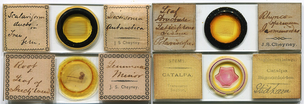 Cheyney moved back to Philadelphia in late 1877, and formed a new business. A catalogue was issued in 1878, “of mounting apparatus and material and of microscopic objects. Made for sale, wholesale and retail”. Slides such as those shown in Figure 1 probably date from this time, at the earliest.