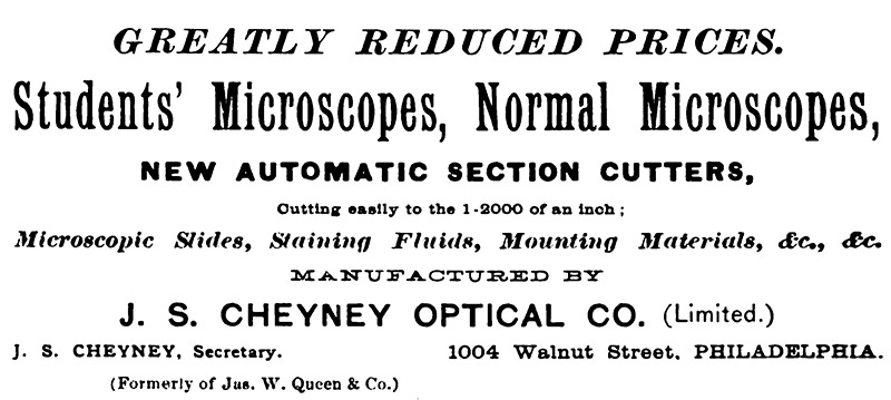 Advertisement from the 1882. Regarding Cheyney’s microscopes, the official report of the 1883 Exhibition of the Biological and Microscopical Section of the Academy of Natural Sciences of Philadelphia stated, “The microscopes shown by J.S. Cheyney had no pretension to fine finish, and could doubtfully be classed among instruments of precision”.