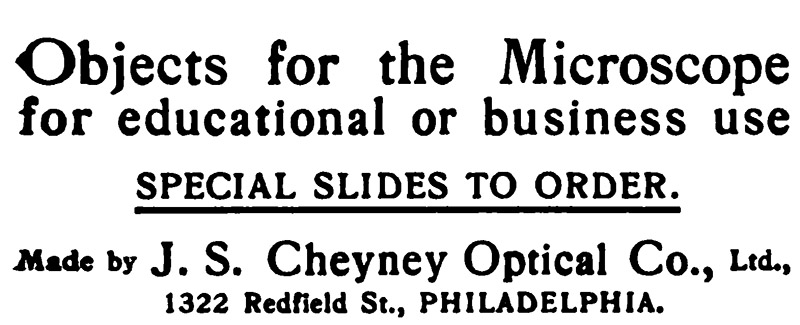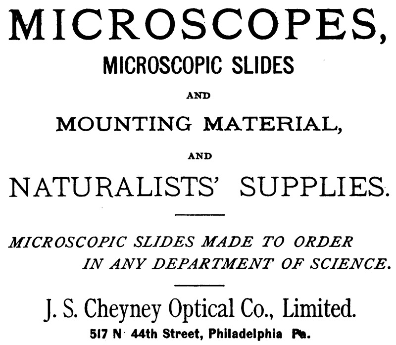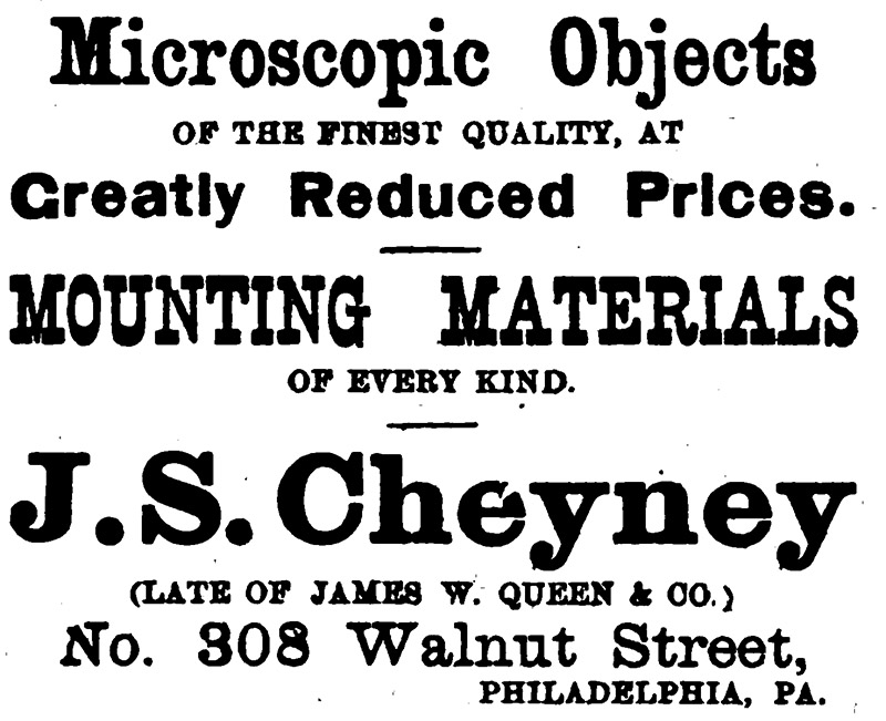 A distant relative, Joseph P. Cheyney, owned a series of photography businesses in Philadelphia, which should not be confused with our microscopist’s businesses. There were some connections, however, such as this announcement from 1881, “Dry plate amateur outfits are made a specialty by Wolf & Cheyney, 821 Filbert Street, Philadelphia, who also keep a full supply of all kinds of photographic requisites. Those who are interested in the microscope and its accessories will be pleased to learn that Messrs. Wolf & Cheyney have been made the Philadelphia agents for the various optical goods manufactured by the J.S. Cheyney Optical Co., Limited, and which includes microscopes, microscopic preparations and supplies”.