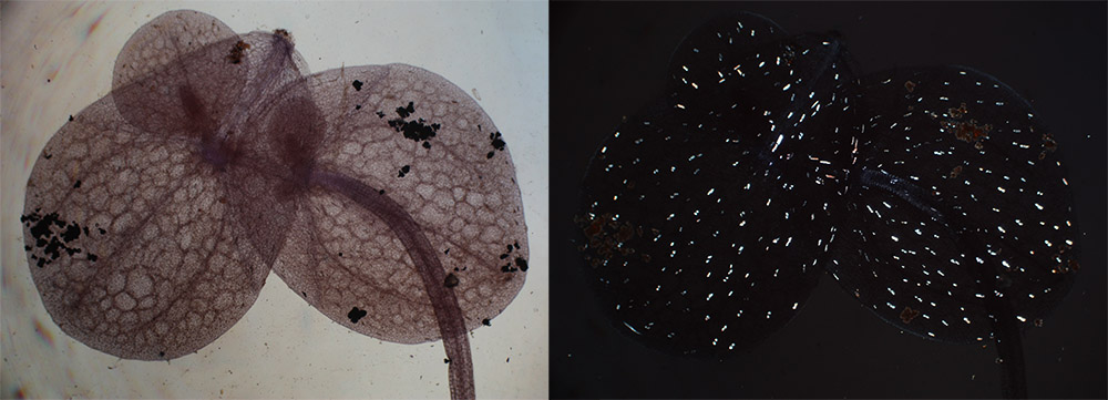 Leaves of duckweed (Lemna minor), viewed under normal transmitted light or with crossed polarizing filters (polariscope). Leaves of L. minor accumulate crystals of calcium oxalate, which glow under polariscope due to their rotation of polarized light. Both photographed with a 3.5x objective lens and C-mounted digital SLR camera